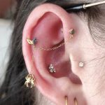 Ensemble de chaînes de piercing très spécial, orné de magnifiques zircons et d’une petite araignée pour égayer votre oreille ! Vous pouvez porter cet ensemble pour relier deux piercings proches (ex. : narine haute, anti-hélix, lobes, etc.).