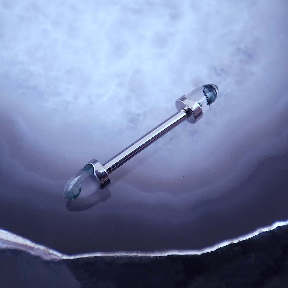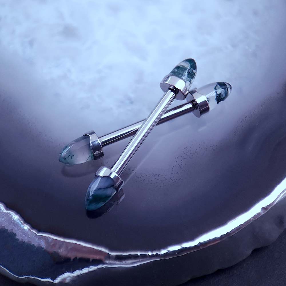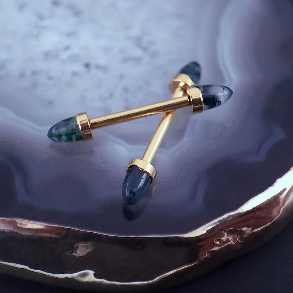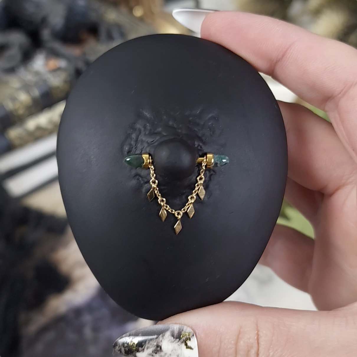 0sez le piercing aux tétons ! 0sez le piercing aux tétons ! Piercing très spécial, élégant et confortable pour votre précieux téton, agrémenté de la magie mystérieuse des pierres d’agate mousse verte naturelles en forme de balles de fusil / baguette magique.