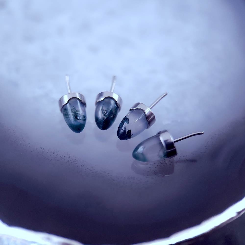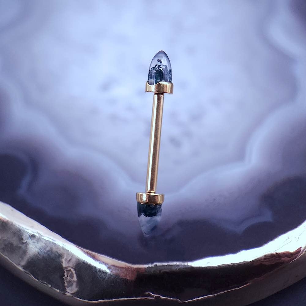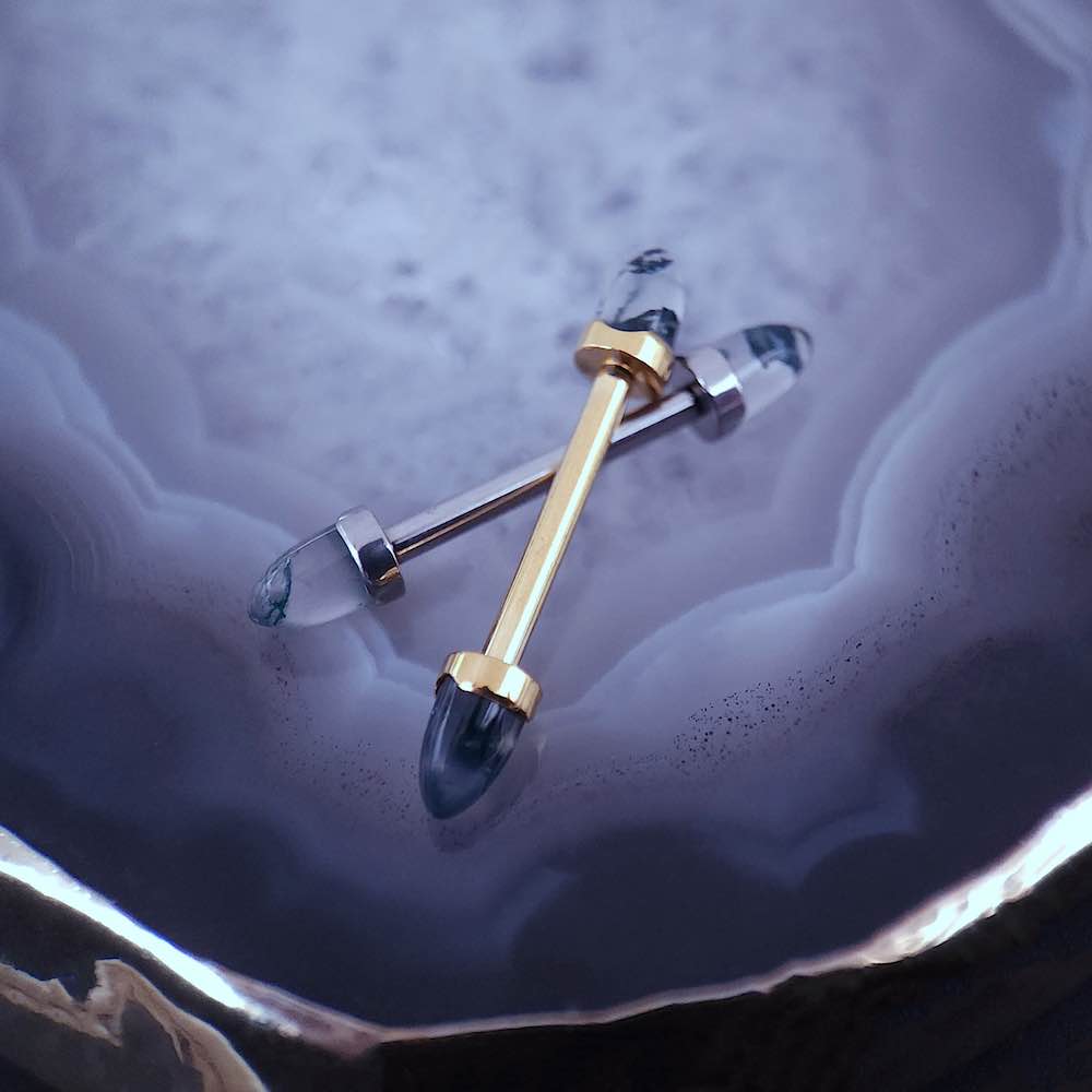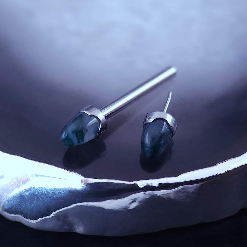 0sez le piercing aux tétons ! 0sez le piercing aux tétons ! Piercing très spécial, élégant et confortable pour votre précieux téton, agrémenté de la magie mystérieuse des pierres d’agate mousse verte naturelles en forme de balles de fusil / baguette magique.