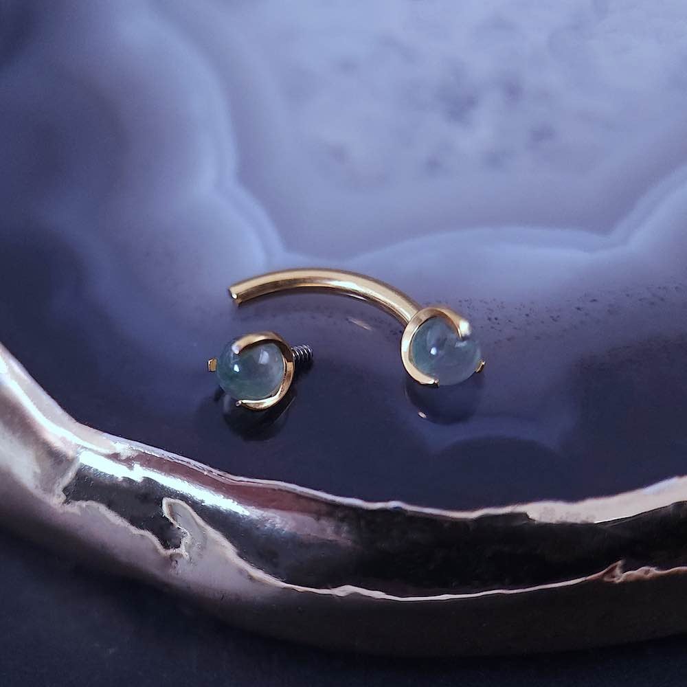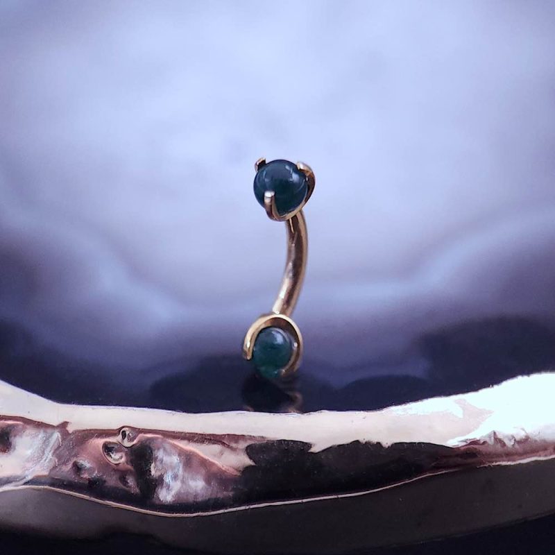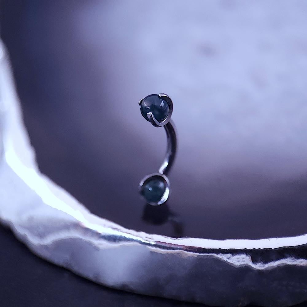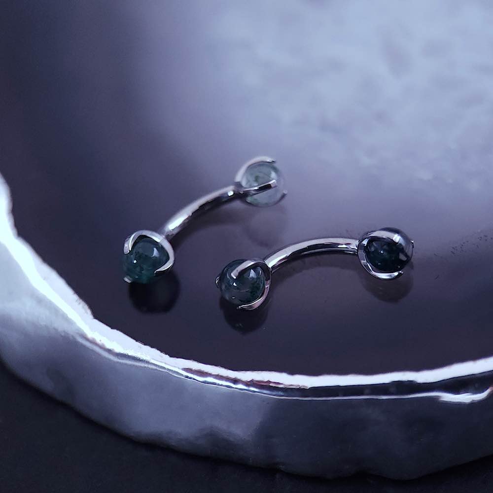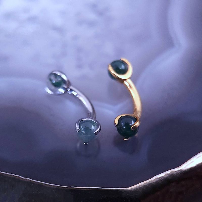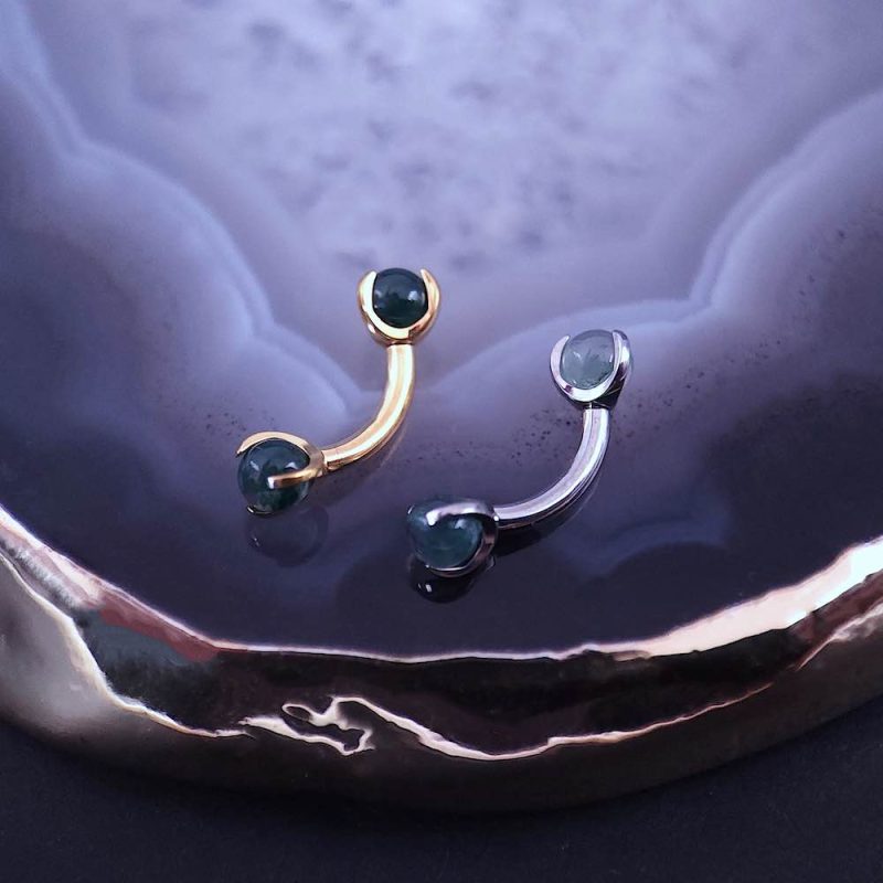 Barre courbe très élégante avec ses mystérieuses pierres d’agate mousse verte. Parfaite pour un rook, jestrum ou vertical labret.