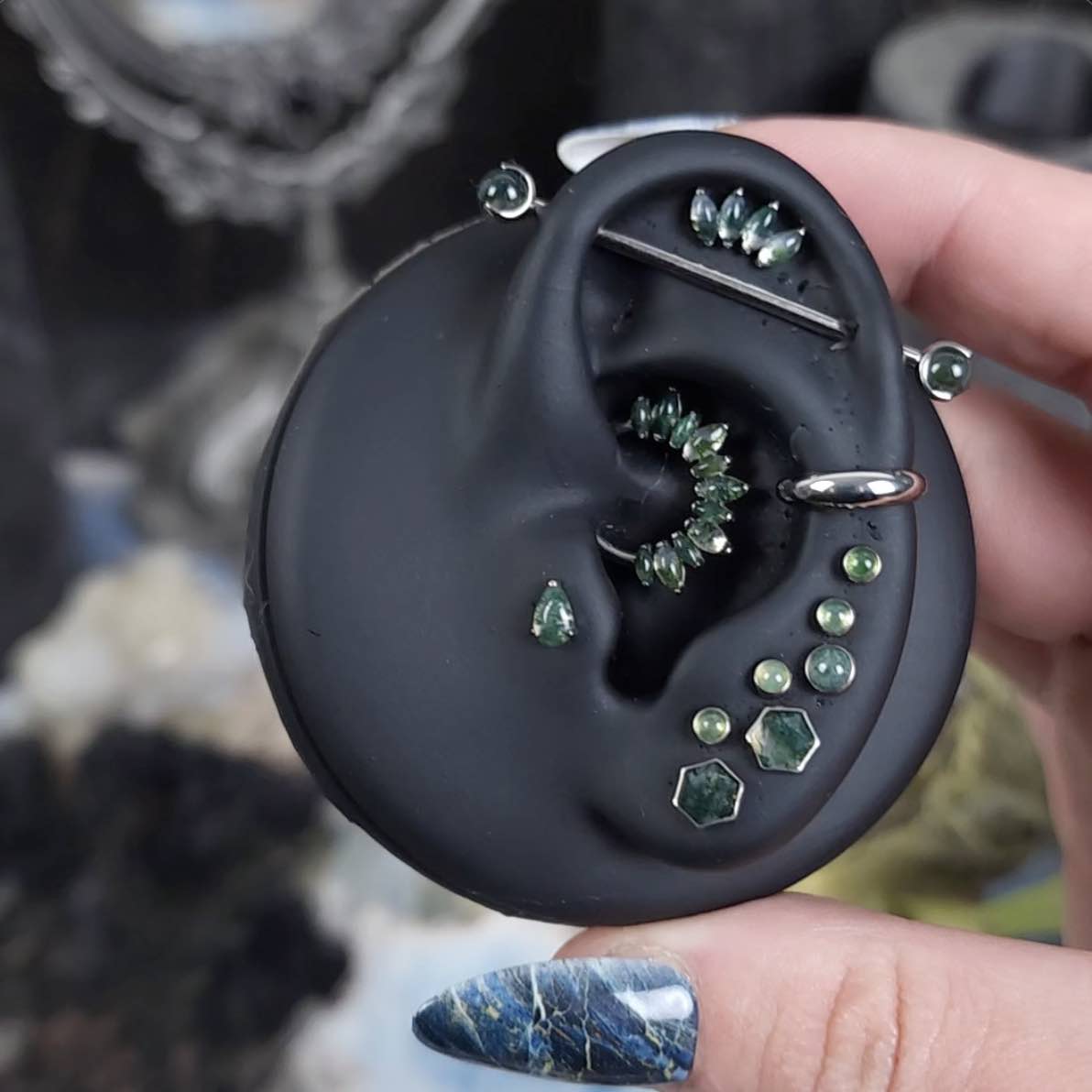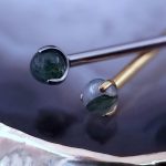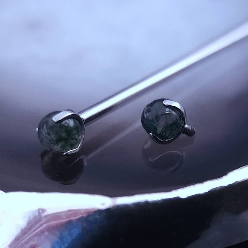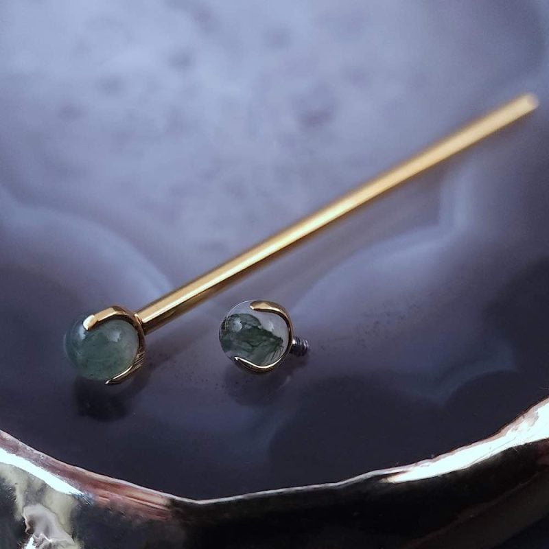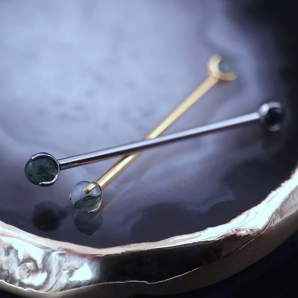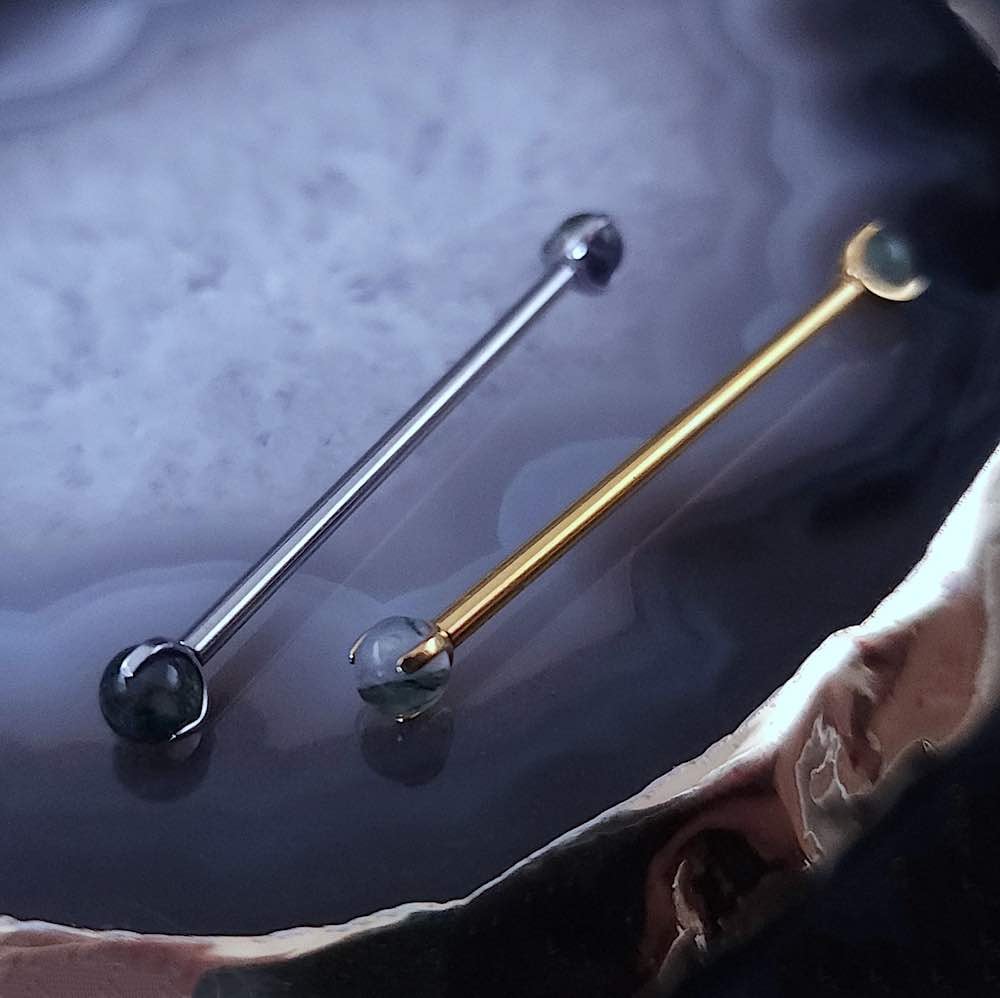 Magnifique barre droite de haute qualité pour piercing industriel, ornée de pierres d’agate mousse verte naturelles. Choisissez votre couleur, votre taille et votre longueur pour les adapter à votre piercing.