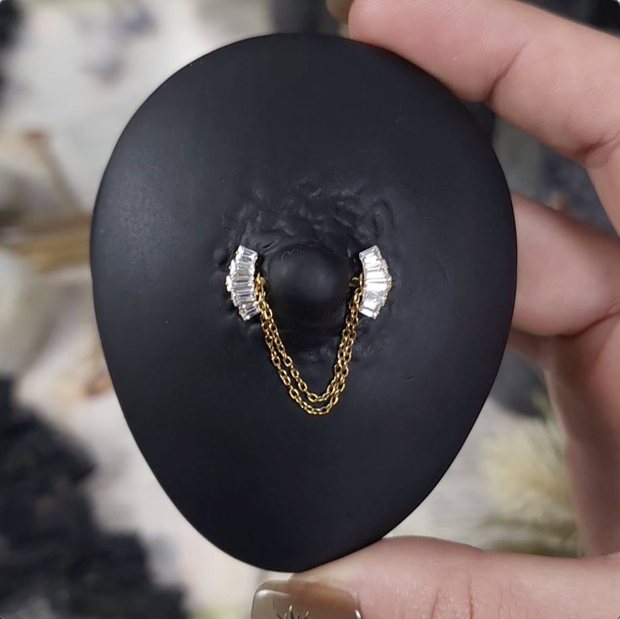 Very nice piercing, sits very nicely on the chest and provides some glitter