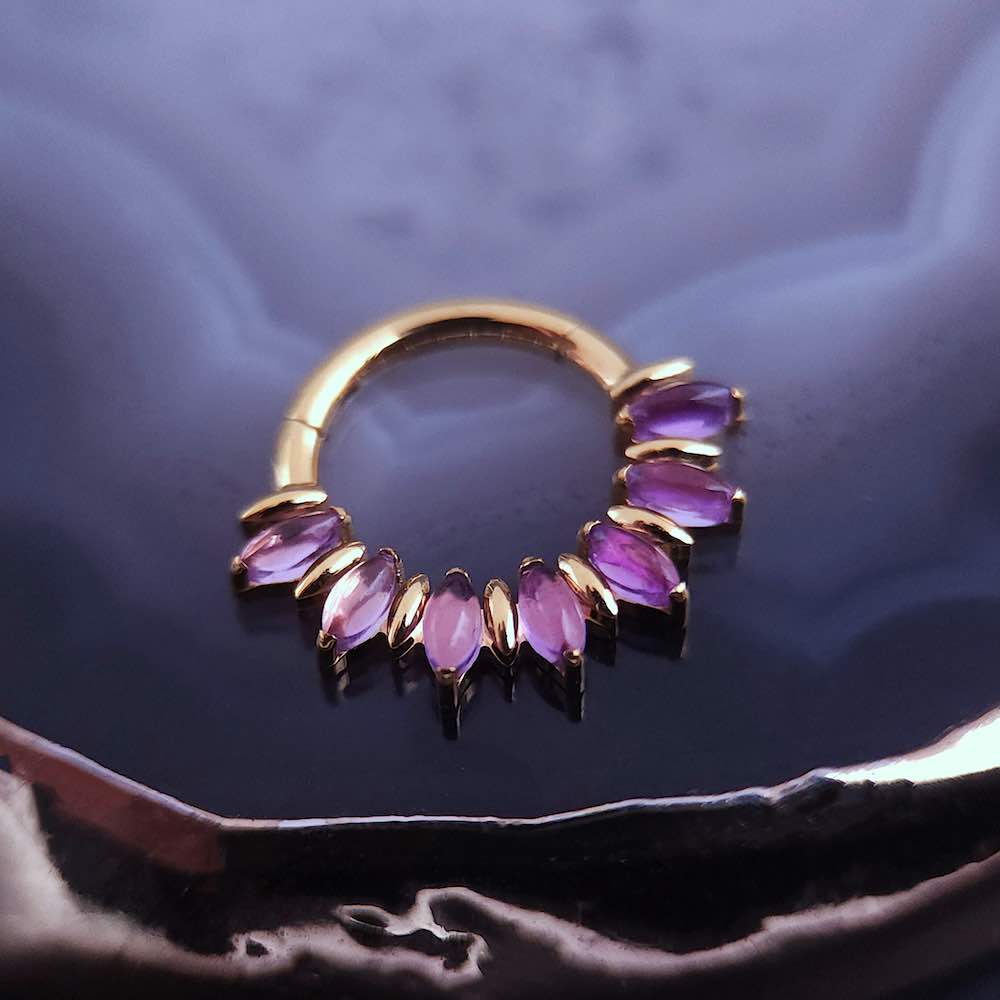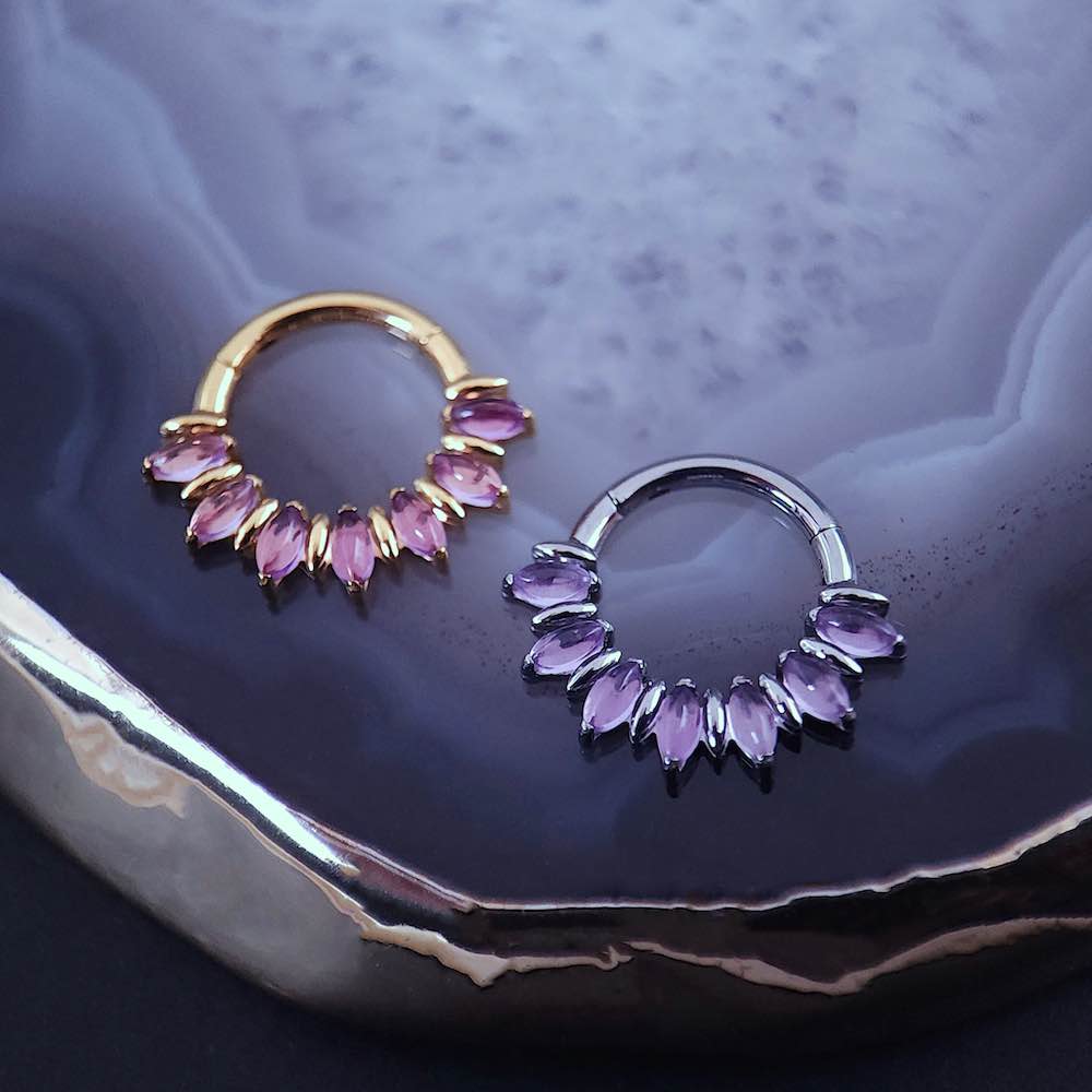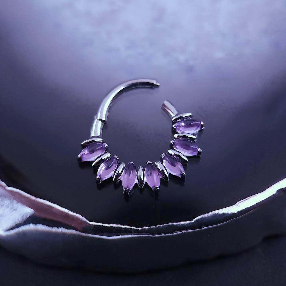 Beautiful natural amethyst clicker, fits just right as the stones are well placed with no irritation like I normally get with this shape clicker. As described it has a cooler tone with the silver option, I love it