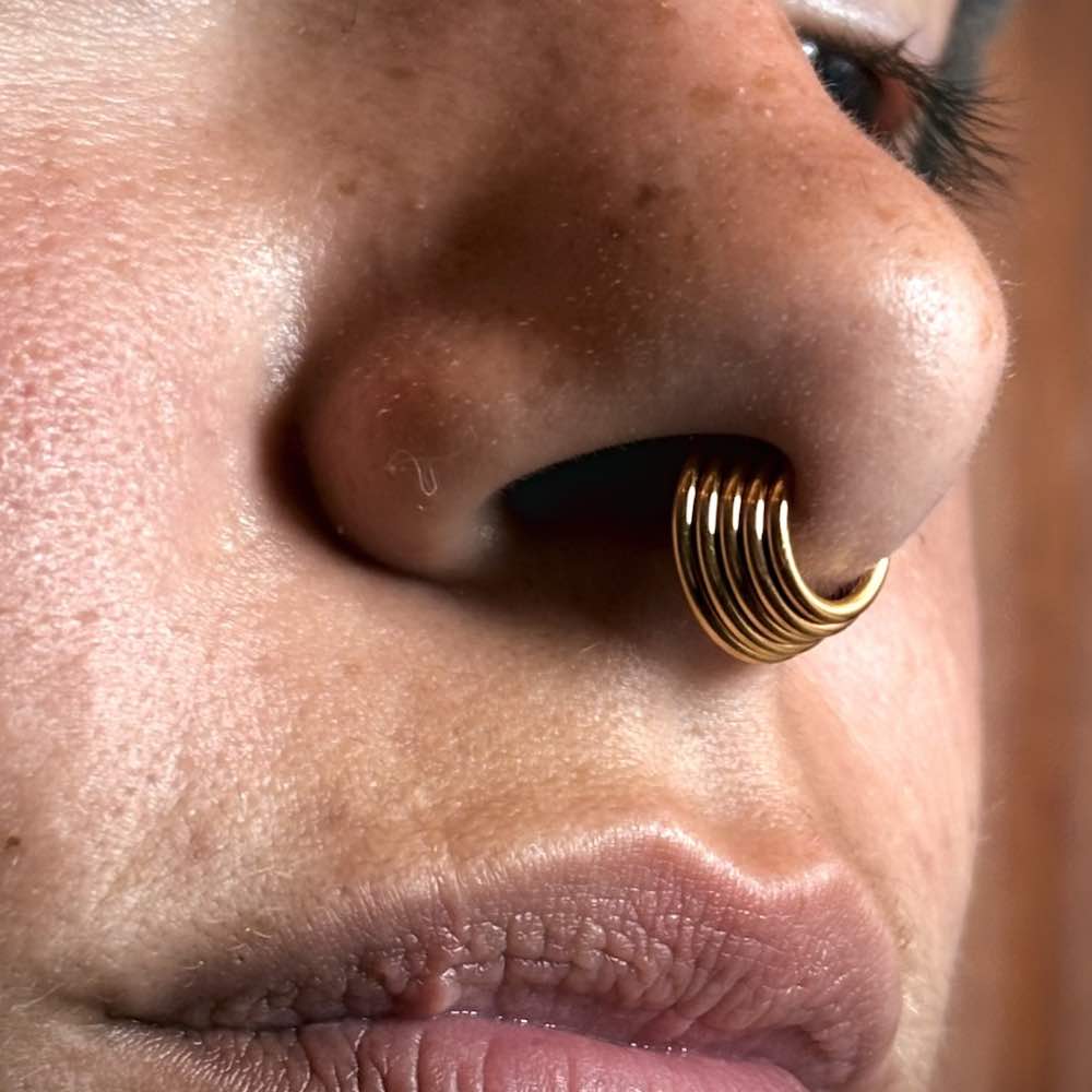 Au septum ce bijou est vraiment classe ! On le remarque et pourtant il a un petit côté discret car il épouse vraiment la forme du nez. Pour le retirer, la technique du fil dentaire est parfaite. Comme toujours la qualité est là avec Maedusa.