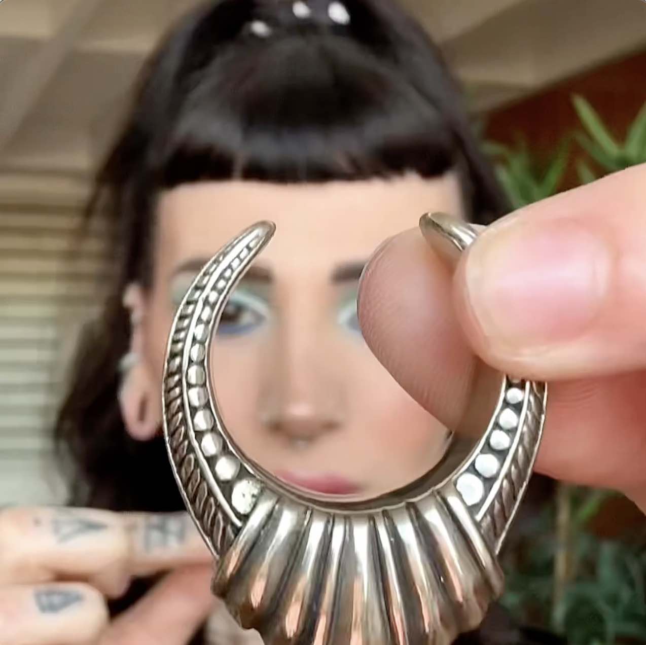 -50%Honor your celestial body with these unique saddle hangers that seems to come from outer space. Very modern and antique style at the same time. Patterns are double sided, slightly shorter on the back. Sold as a pair for stretched piercings.